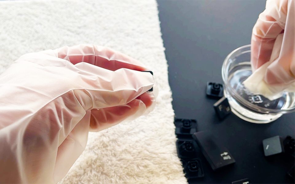 キートップを外し、ウェットティッシュなどで拭くとキートップが濡れた状態になります。