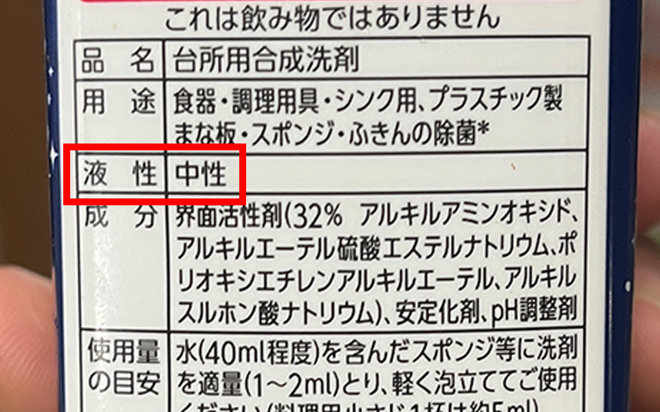 持っている洗剤が中性かどうか確認するには、洗剤の裏側に書かれている”液性”の表記を見ましょう。